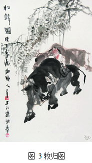 从题材上来讲,郑军里的人物画多为传统的历史题材和与广西桂西人物相关的生活题材,前者的作品有《老子出关》(图1)、《米癫狂书》、《游春图》等,后者有《山雨欲来》、《牧归图》(图3)等。总的说来,郑军里的绘画有以下几个特点: