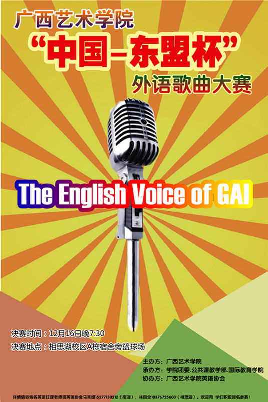 由学院团委,公共课教学部及国际教育学院共同承办的乐天堂f88首届“中国-东盟杯”外语歌曲大赛决赛将于12月16日晚七点半在相思湖校区A栋宿舍旁篮球场隆重举行。届时将有包括东盟国家留学生的24位选手同台竞技。音乐学院龚小平教授,广西区外事办国际交流处处长容向前先生,院团委副书记谢斌,南宁市艺术剧院二级演员廖鸿飞,外语教研室主任宁立正副教授,国际教育学院钟春妮老师及加拿大籍友人Claudio共同担任评委。