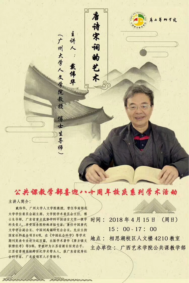 讲座之二:《唐诗宋词的艺术》,时间:4月15日15:00一17:00,地点:相思湖校区人文楼4210教室。